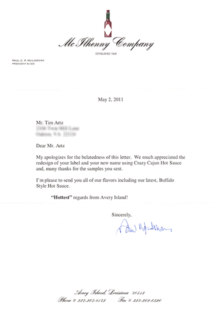 Back in 2010 when the Washington Post did its feature on me, their photographer got a nice shot of my sauces. One of those was my “Wacky T#######” sauce. The photo was right there on the front page of the Food Section. A few weeks later, I got a rather testy call from Avery Island, from the CEO of the company, insisting that I change my label. While I was on safe legal ground, I felt it was best to make nice with a billionaire who has endless resources to make my life miserable. With my conversation with him fresh in mind, I relented and changed the sauce to “Crazy Cajun Hifallootin’ Hot Sauce.” I was left with quite a story!